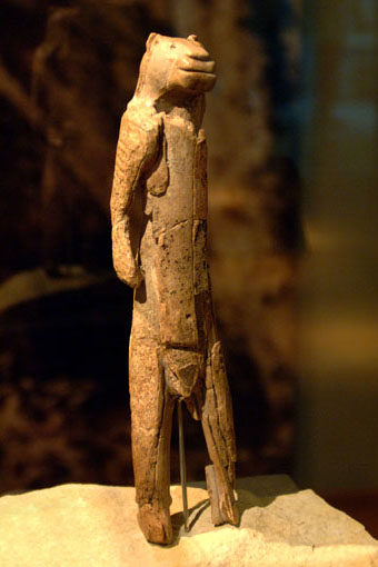 A teenager by comparison, the cave painting known as “The Sorcerer” dates back a mere 140 centuries….like his older brother the Lion Man, is a therianthrope–a combination of man and beast. A gently curving tail dangling genitalia adorn an otherwise human rump. His upper arms are pressed ritghtly against his torso while his forearms, thrust straight out, end in paws. His head sports antlers, tufted animal ears–and a pair of human eyes, round and looking over his shoulder as if startled.